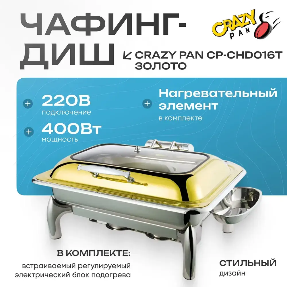 Чафинг-диш Crazy Pan CP-CHD016T предназначен для постоянного подогрева первых и вторых блюд и поддержания их оптимальной температуры на предприятиях общественного питания и торговли. Модель оснащена крышкой с гидравлическим подъемным механизмом, позволяющим ей надежно удерживаться в открытом состоянии под углом 90°. Нагрев можно осуществлять с помощью встраиваемого электрического блока или стандартной горелки. Корпус выполнен из нержавеющей стали.