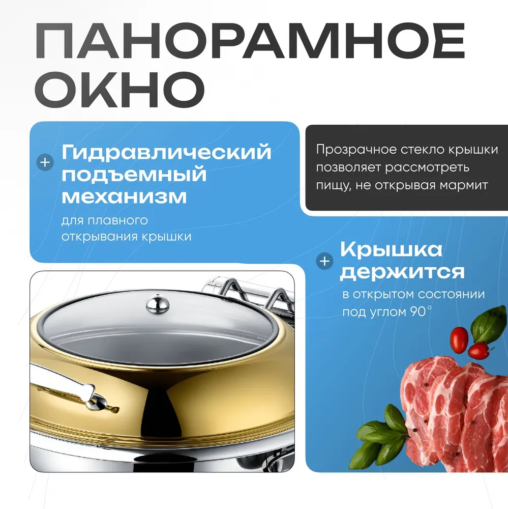 Чафинг-диш Crazy Pan CP-CHD018T предназначен для постоянного подогрева первых и вторых блюд и поддержания их оптимальной температуры на предприятиях общественного питания и торговли. Модель оснащена откидной крышкой с ручкой. Корпус выполнен из высококачественной нержавеющей стали марки 201 с глянцевой серебристой поверхностью, крышка с глянцевым покрытием оттенка титан.
