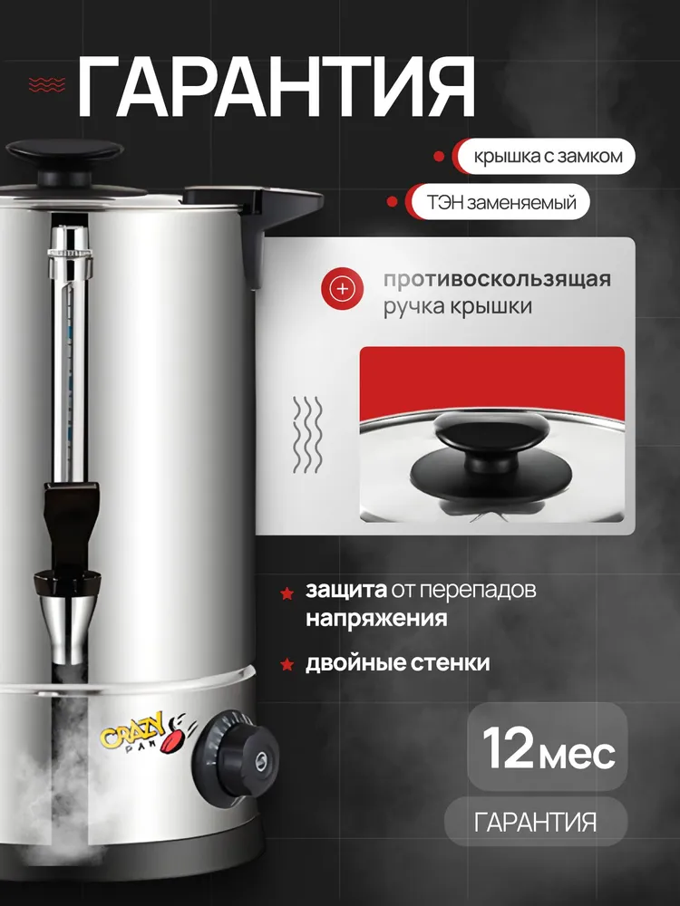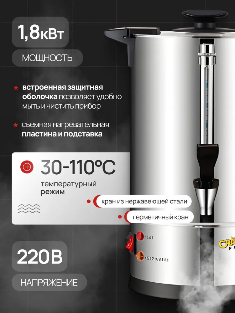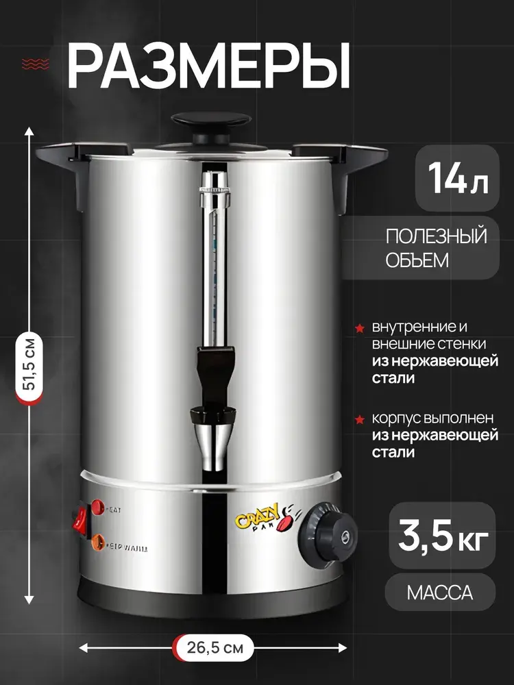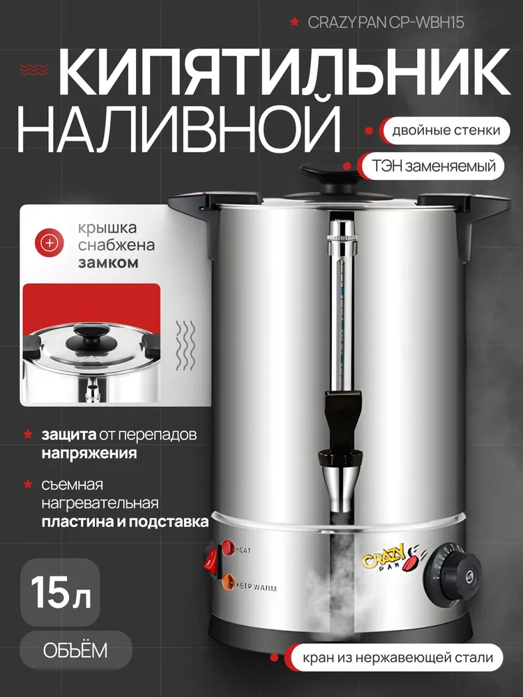Кипятильник Crazy Pan CP-WBH15 предназначен для нагрева воды и последующего поддержания ее заданной температуры на предприятиях общественного питания и торговли. Модель оснащена высокомощным нагревательным элементом, позволяющим быстро нагревать воду и прочным герметичным краном для наливания жидкости. Внутренние стенки корпуса выполнены из нержавеющей стали AISI 304, внешние - AISI 201.