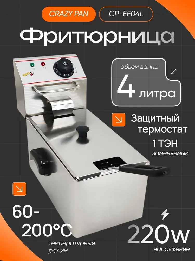 Фритюрница Crazy Pan CP-EF04L предназначена для приготовления различных продуктов в большом количестве масла на предприятиях общественного питания и торговли. Модель оснащена блоком нагрева, терморегулятором, 1 ТЭНом, вилкой и съемной корзиной с ручками. Корпус выполнен из нержавеющей стали.