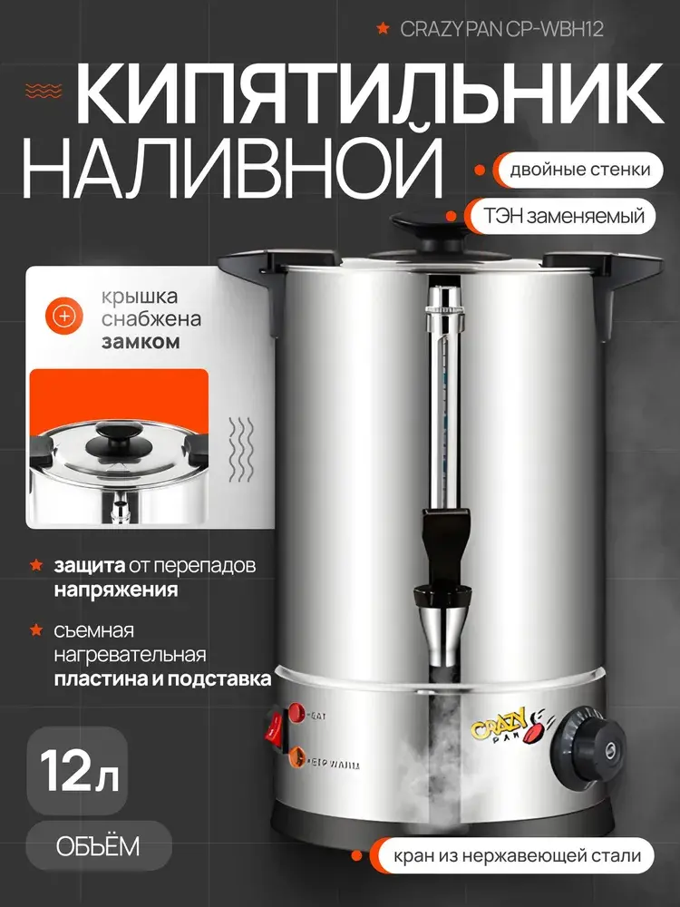 Кипятильник Crazy Pan CP-WBH12 предназначен для нагрева воды и последующего поддержания ее заданной температуры на предприятиях общественного питания и торговли. Модель оснащена высокомощным нагревательным элементом, позволяющим быстро нагревать воду и прочным герметичным краном для наливания жидкости. Внутренние стенки корпуса выполнены из нержавеющей стали AISI 304, внешние - AISI 201.
