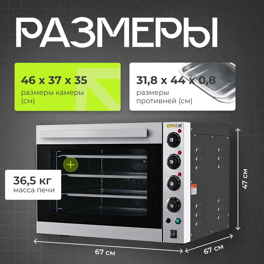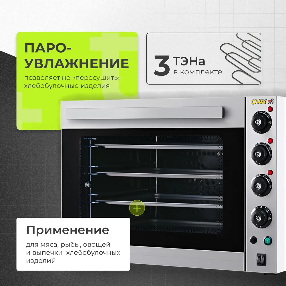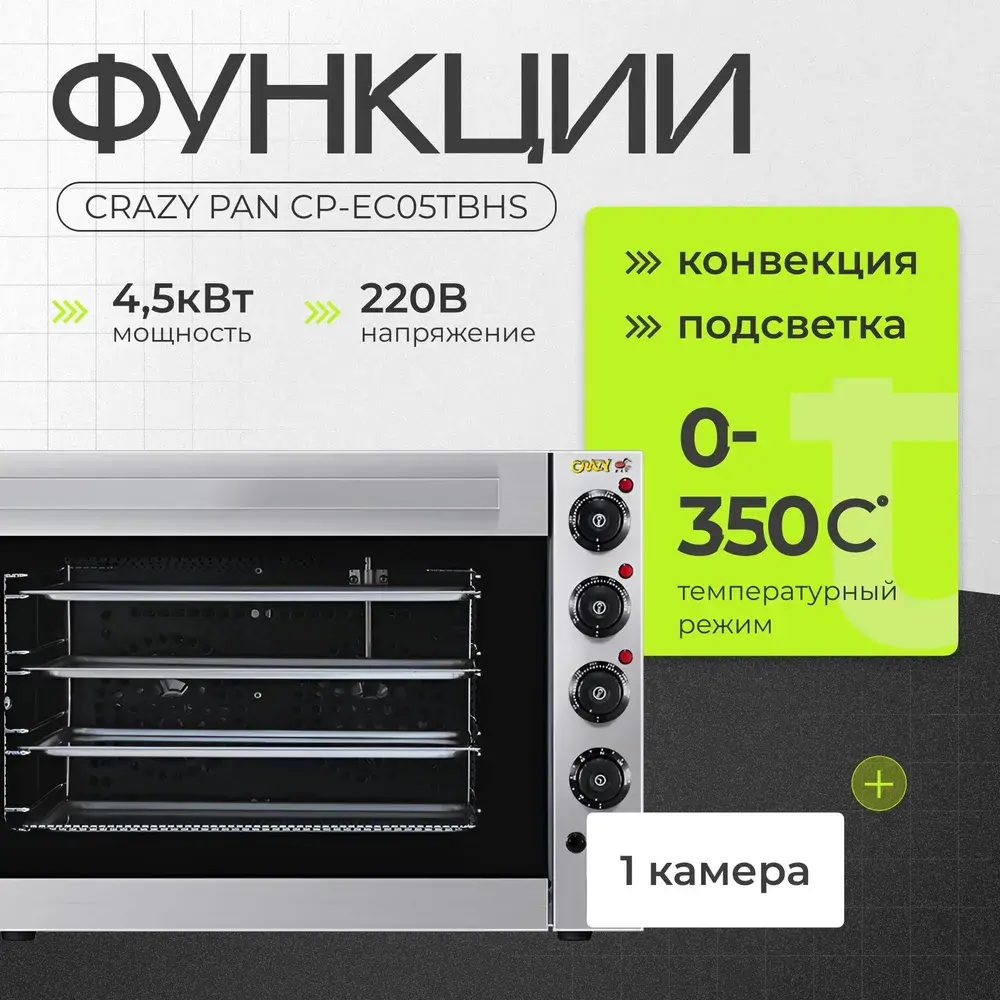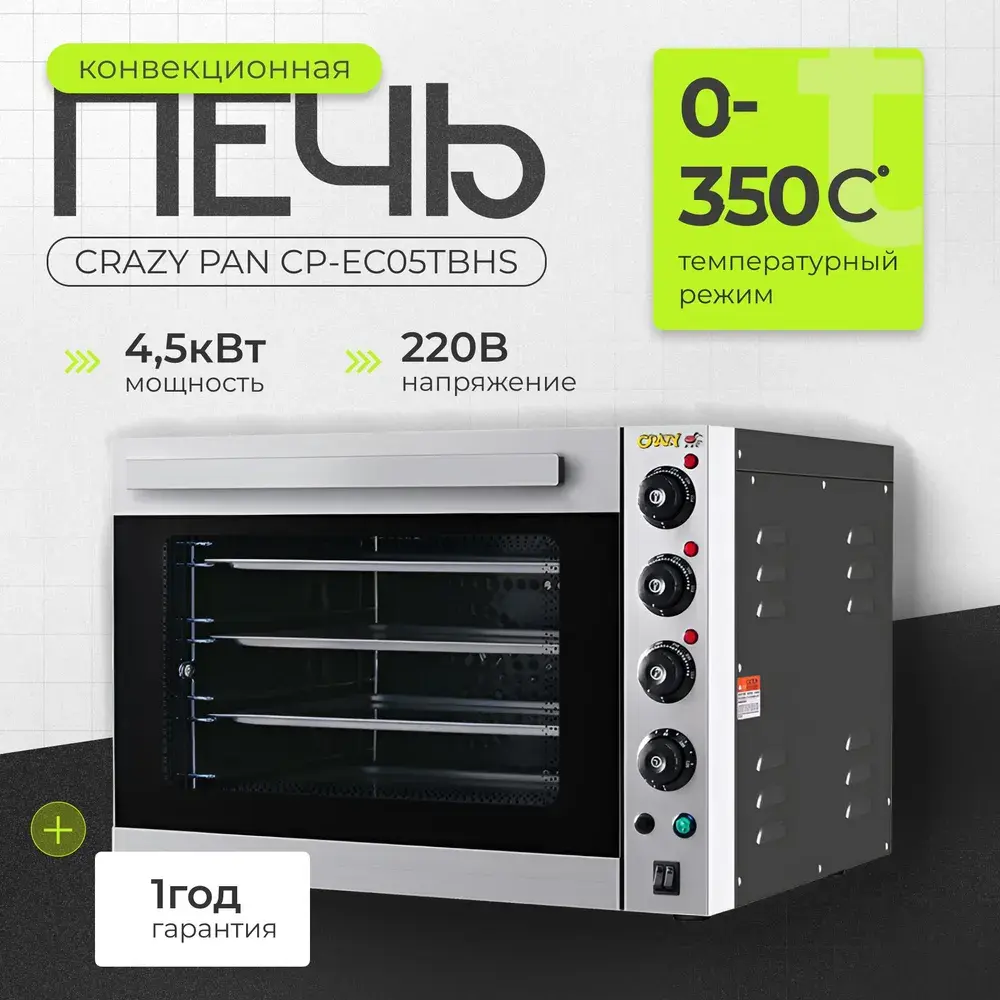 Конвекционная печь Crazy Pan CP-EC05TBHS предназначена для выпекания или разогрева кондитерских и хлебобулочных изделий, различных блюд, замороженных или предварительно выдержанных в расстоечном шкафу заготовок из теста на предприятиях общественного питания и торговли. Модель оснащена 3 ТЭНами, таймером и внутренней подсветкой.