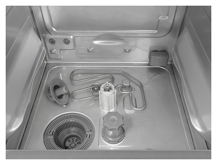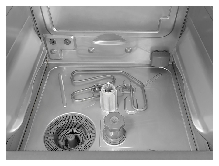 - Система ополаскивания с атмосферным бойлером и насосом ополаскивания HTR (температура поверхности посуды достигает 70 °С в течение 1 минуты)