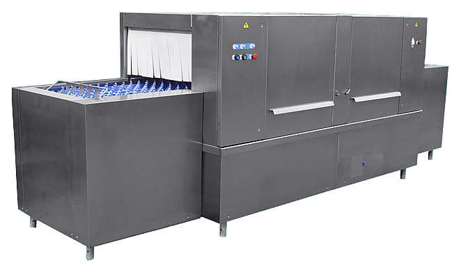 Туннельная посудомоечная машина ГродТогрМаш ММУ-1000М предназначена для мытья тарелок, стаканов, чашек, столовых приборов и подносов размером не более 530х325 мм на предприятиях общественного питания. Модель оснащена электронной панелью управления.