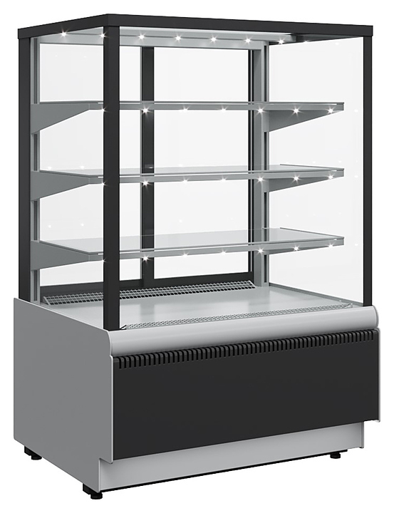 Кондитерская витрина Carboma KC70 VV 0,9-1 Standard (ВХСв - 0,9д Cube Люкс Техно) используется на предприятиях общественного питания и торговли для демонстрации, охлаждения и кратковременного хранения тортов, пирожных и других кондитерских изделий. Модель оснащена прямыми стеклопакетами. Корпус выполнен из стали, боковины - из металла толщиной 2,5 мм, раздвижные задние створки на роликах - из стеклопакета, термоизоляция корпуса - из пенополиуретана.