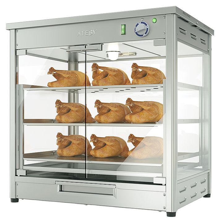 Тепловая? витрина ATESY ВК-4 Э используется на предприятиях общественного питания и торговли для кратковременного хранения и демонстрации приготовленных тушек или частей кур, горячих закусок и вторых блюд в горячем виде. Модель оснащена 3 выдвижными перфорированными полками для выкладки продуктов и готовых блюд. Каркас и полки выполнены из пищевой нержавеющей стали AISI 430, корпус - из стекла.
