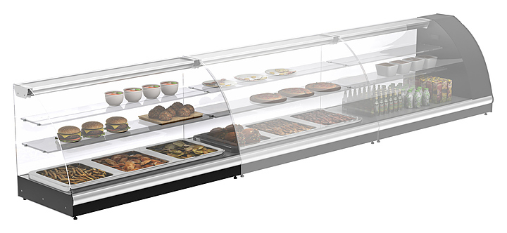 Тепловая витрина Carboma А57 SH 1,2-1 (ВТ-1,2 Арго XL Люкс) используется на предприятиях общественного питания и торговли для демонстрации и поддержания в горячем состоянии булочек, пирогов, различных закусок и готовых блюд. Модель онащена гнутым передним стеклом, 2 стеклянными полками и регулируемыми ножками высотой от 20 до 35 мм. Поверхность выкладки выполнена из золотой стали, передняя обшивка - из коричневой стали, боковины - из стекла.